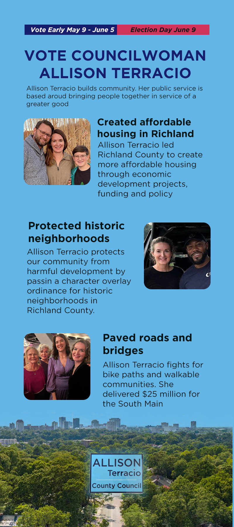 Re-electing Allison Terracio means continuing thoughtful, community-centered leadership that prioritizes long-term impact, accountability, and progress for all Richland County District 5 residents.